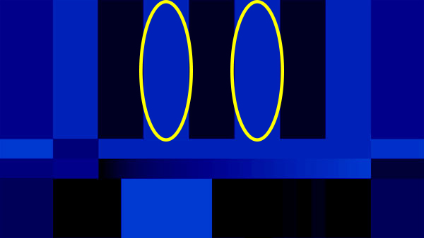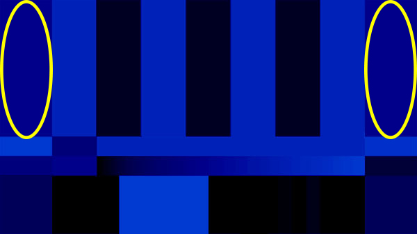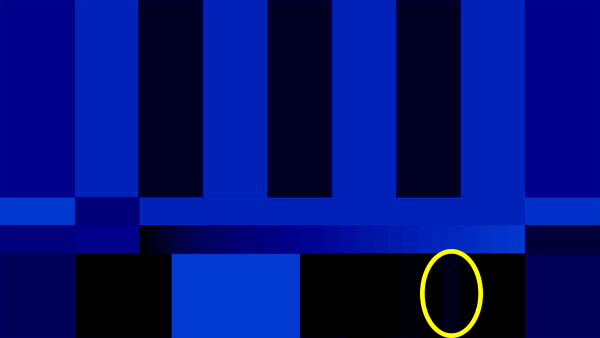 Start your calibration with the brightness adjustment. Brightness is the black level setting on your monitor. Turn the brightness up or down so that the bar circled in the image above is just barely visible against the black on either side. It is easiest to bring the brightness all the way up or all the way down and work your way back to get a feel for how the image responds.