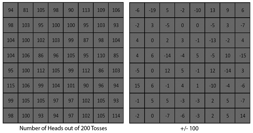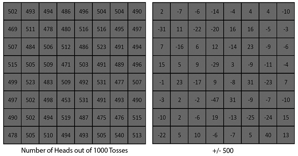 Imagine that the light hitting the sensor is grey and of a uniform intensity. We also know that this light has small random variances in the way it hits the sensor and is read. These variances are expressed by the coin toss. If this happened in a world of exacting probabilities, you would end up with an even division of heads and tails each time. But we live in a world of randomness and chaos, so each square in the image below has the number of times heads came up out of 1000 coin tosses for that square, and then the numerical variance above or below the perfect 500 average.