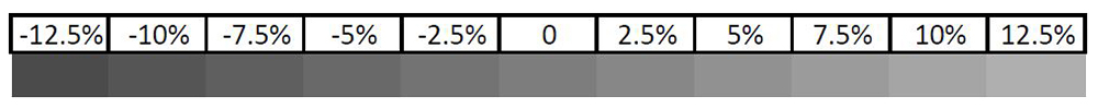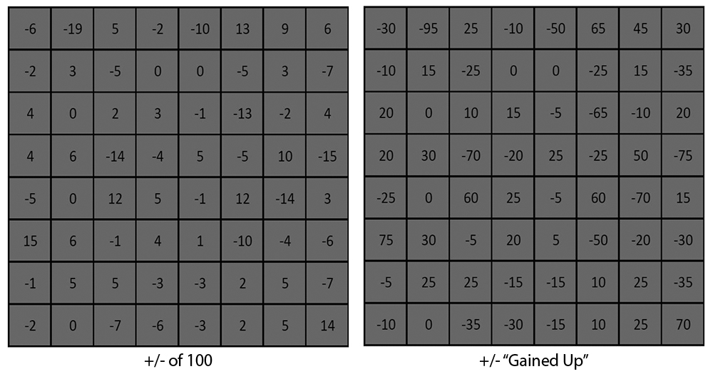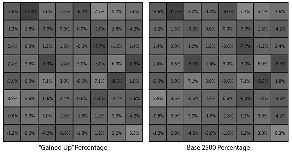 Now lets change +/- count to percentage variance and shift the color of the corresponding squares lighter or darker depending on how far away from the statistical average each square is. We will once again be using our arbitrary standard deviation of +/- 2.5%. If the value of the square is +2.5% or higher the square gets lighter. If the value is -2.5% or lower, the square gets darker. For every additional 2.5% of variance the square would get lighter or darker still, reflecting the greater distance from the average.