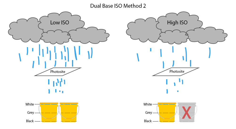 In a dual native system there is a second circuit, or bucket, for each photosite. To get the second base ISO, the camera does one of a couple of things, depending on which manufacturer the camera is from. I have heard it explained that in some camera systems the sensor swaps from one capacitor to another of a different size.