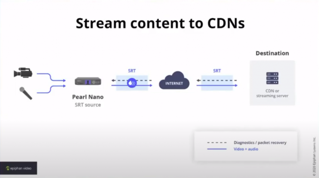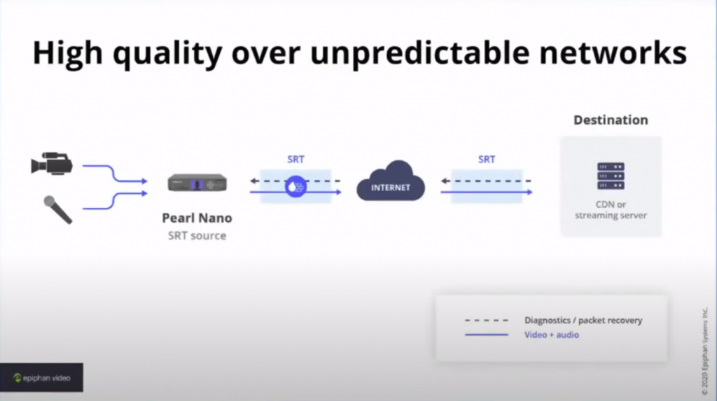 - RTMP (the older and most common way of sending video – for example with YouTube or Facebook) just ‘throws at the wall and hope it sticks’ over the internet and just hopes it gets there.