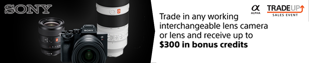 [This page and promotion are no longer active] Sony Trade-In/Trade-Up Promotion – January 20, 2020 through March 29, 2020 Promotion Details: Trade-in any working digital or film interchangeable lens camera or lens and receive up to a $300 bonus towards the purchase of select Sony Alpha cameras or lenses plus the value […]